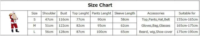 Package includes: Tops + pants + hat + wigs + beard + belt + shoe cover + bag + gloves