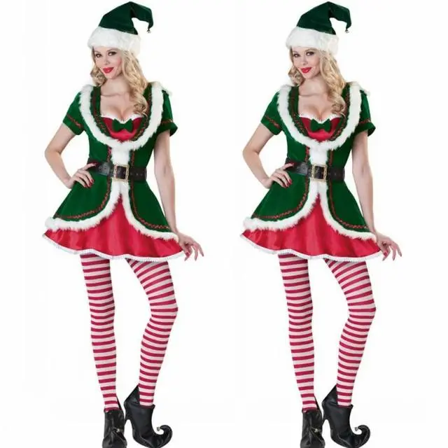 New Hot Christmas Cosplay Elf Costume Sexy Green And Red Dress Belt Headwear For Adult Women Uniform temptation Masquerade