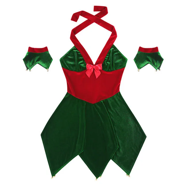 Halter neck and deep-V design, with arm cuffs decorate bells, make you nice and just a little bit naughty.